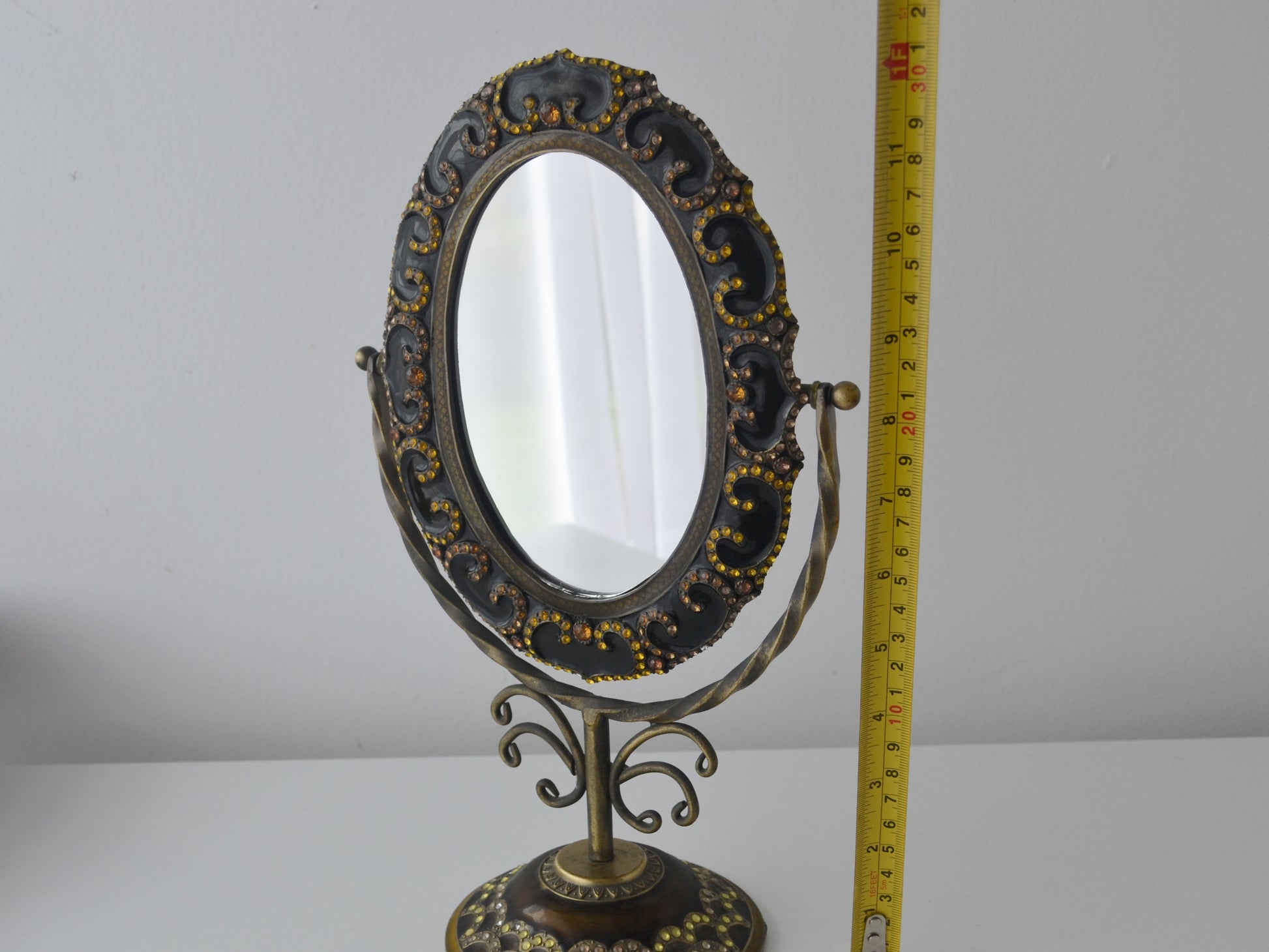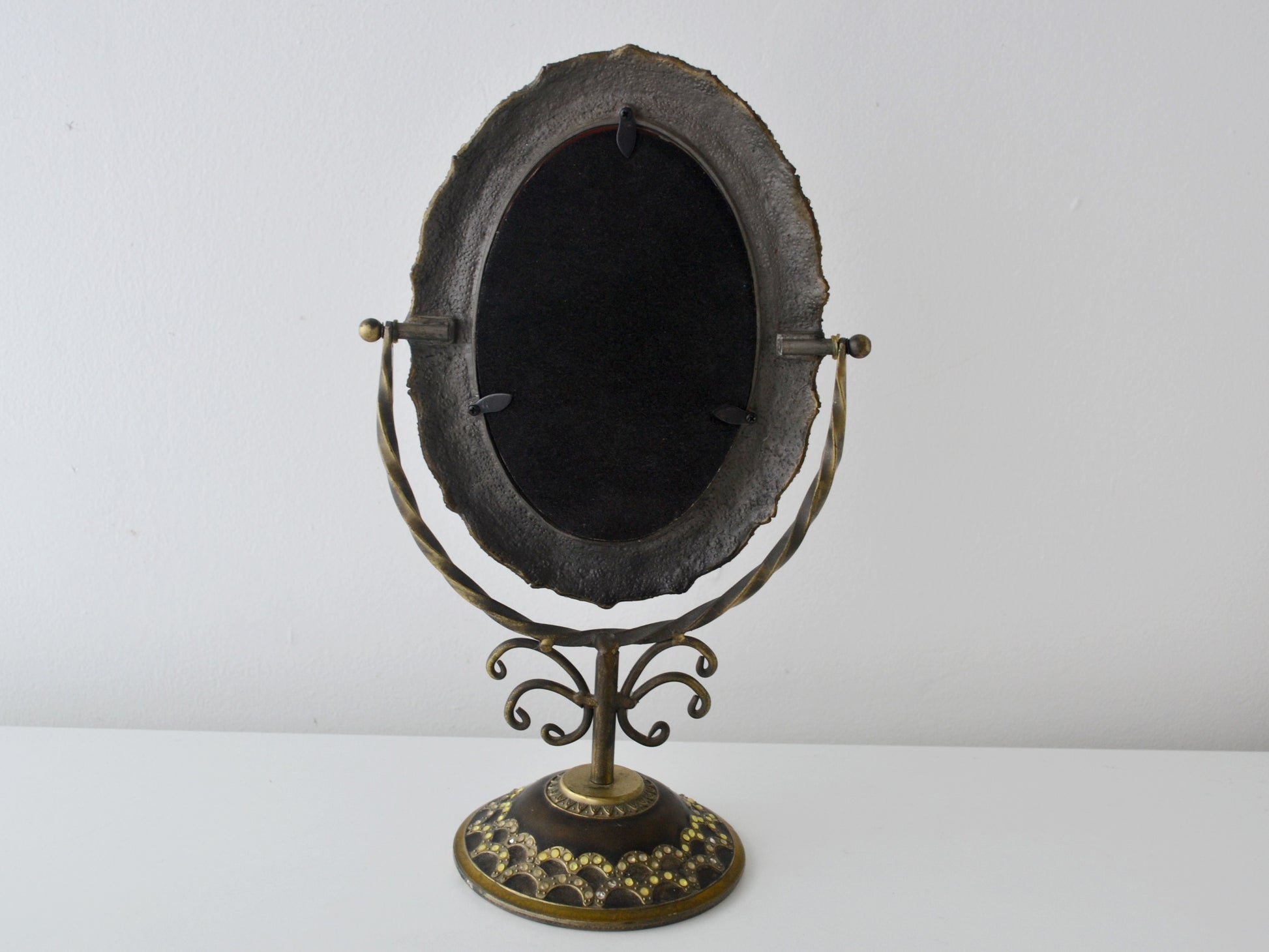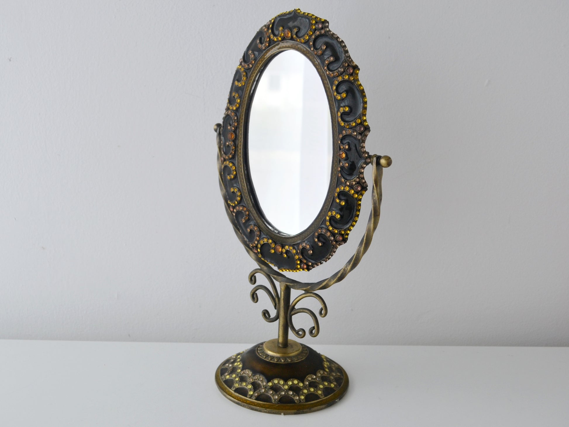 A brass and bronze alloy tilting oval vanity mirror on a pedestal stand, the oval frame densely set with black enamel rocaille scrollwork and encrusted throughout with faceted rhinestones in golden yellow, amber and clear. The twisted wire upright rises from a domed circular base, itself decorated with black enamel scallop pattern and rhinestone border, with a finely engraved brass collar at centre. Felt pad to the underside of the base for surface protection. The mirror tilts freely on its axis. Indian, in the tradition of highly decorative brass and enamel vanity objects produced for the export and collector market, circa 1960s. Maker unknown.