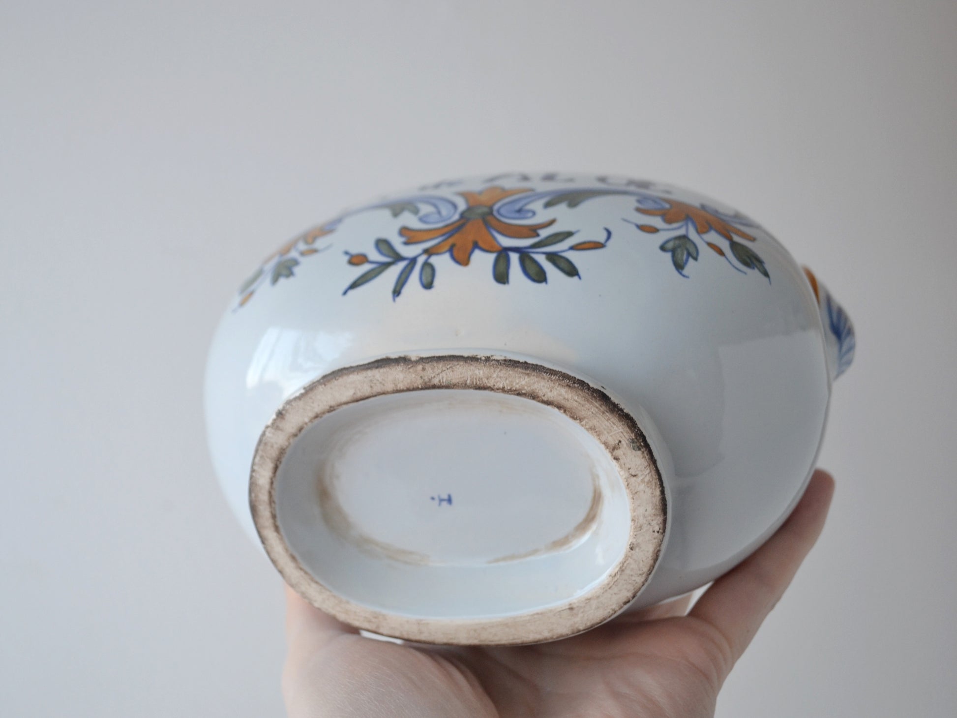 OBJECT DETAILS An ideal piece for interior designers sourcing authentic antique apothecary or curiosity cabinet objects, for collectors of French faience, or for film and TV prop buyers seeking a period-accurate pharmacy or cabinet of curiosities piece. This is a French faience apothecary bottle / albarello of the traditional flattened pilgrim flask form, with two small loop handles at the shoulders. The body is hand-painted in cobalt blue, burnt orange and sage green on a white tin-glazed ground, with bold foliate and acanthus scroll decoration surrounding the central cartouche inscribed P. de ALOE — Pulpa de Aloe, a traditional pharmaceutical preparation. The neck is decorated with blue and orange banded stripes and retains its original cork stopper, which shows a light pale blue-white patina consistent with age. A small manufacturing irregularity is present at the neck where the glaze meets the cork — characteristic of hand-thrown faience production and not a defect. A small maker's mark in blue is present on the base. Style: French faience, apothecary / pharmacy. Material: tin-glazed earthenware. Era: circa 18th–19th century. Origin: France. Maker: unknown, workshop mark present on base.