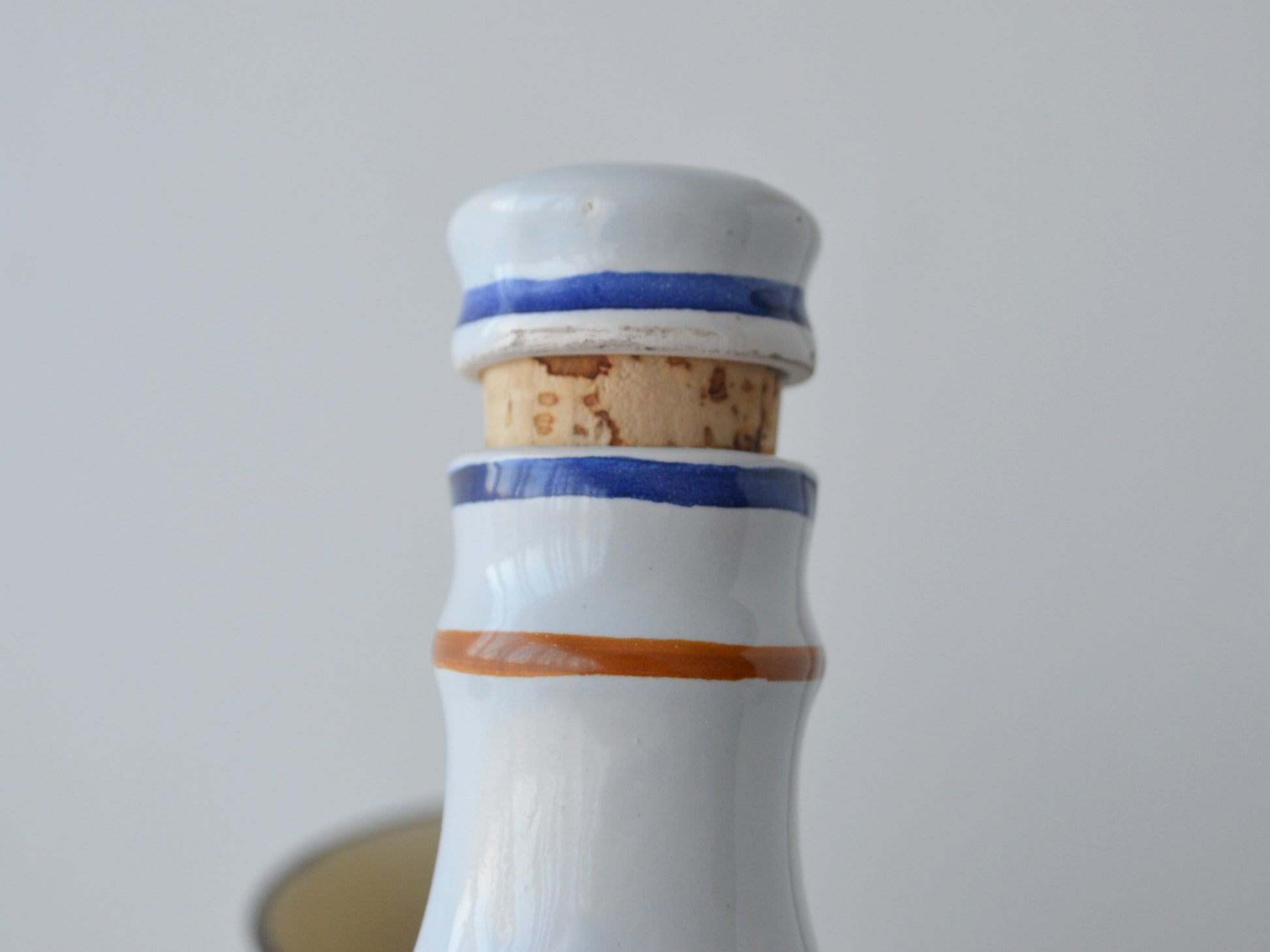 CONDITION REPORT In very good antique condition, consistent with age and use. Tin glaze intact throughout with no visible cracks, chips or restoration. Hand-painted decoration vivid and well-preserved. Original cork stopper present and in excellent condition, with characteristic pale blue-white age patina. Minor manufacturing irregularity to the glaze at the neck — present from production, not damage. Unglazed foot ring shows natural age darkening consistent with an antique piece. Photographs form part of this description. Please review all images carefully as they document the piece's condition in full detail.