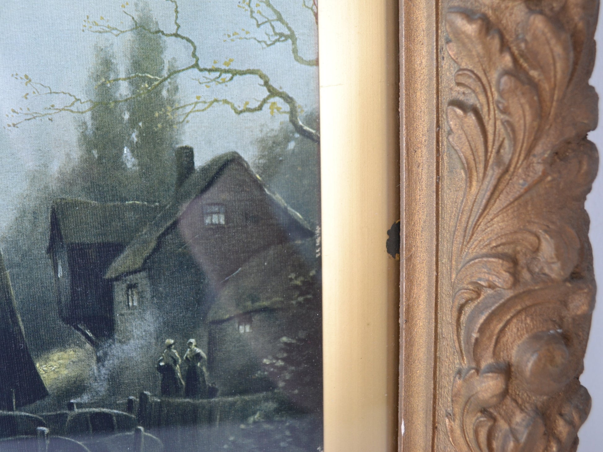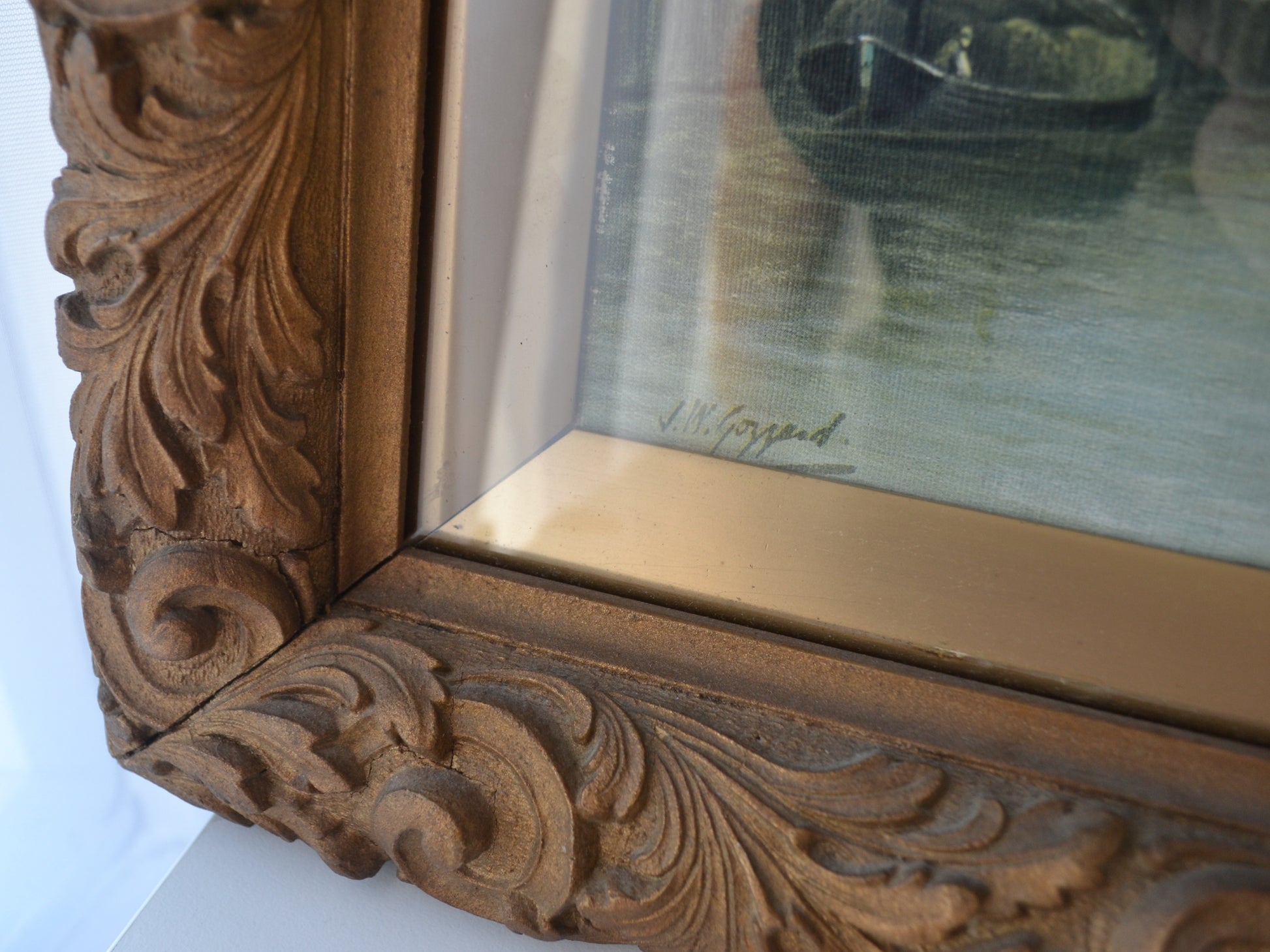 A framed chromolithographic print depicting a river harbour scene with sailing vessels, rowing boats, and riverside cottages under a dramatic sky — after the work of J.W. Gozzard, the English painter of maritime and river landscapes, active circa 1880–1920. The print is presented behind bevelled glass within a deep box frame of exceptional quality: a heavy composition resin acanthus scroll relief moulding in warm oak tone, with an inner gilt slip. The frame construction is robust and intact — the composition resin has proven highly durable, retaining its relief detail throughout.